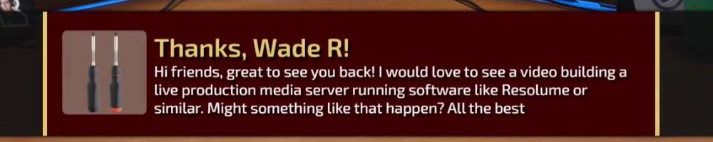 Hi friends, great to see you back! I would love to see a video building a live production media server running software like Resolume or similar. Might something like that happen? All the best