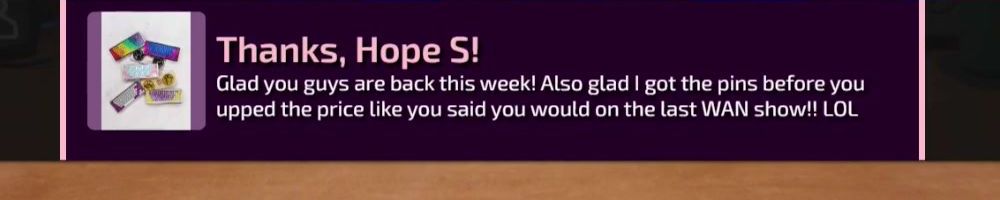 Glad you guys are back this week! Also glad I got the pins before you upped the price like you said you would on the last WAN show!! LOL