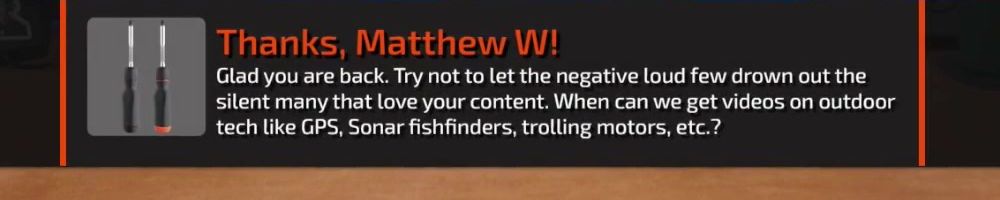 Glad you are back. Try not to let the negative loud few drown out the silent many that love your content. When can we get videos on outdoor tech like GPS, Sonar fishfinders, trolling motors, etc.?