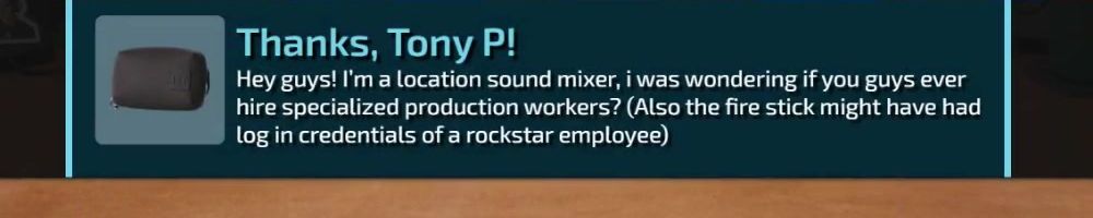 Hey guys! I'm a location sound mixer, i was wondering if you guys ever hire specialized production workers? (Also the fire stick might have had log in credentials of a rockstar employee)