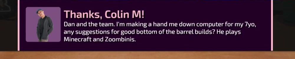 Dan and the team. I'm making a hand me down computer for my 7yo,