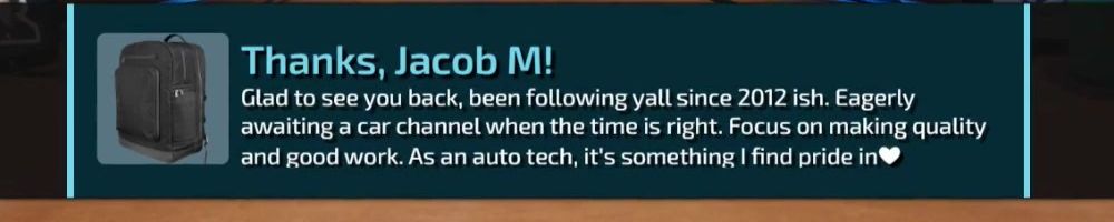 Glad to see you back, been following yall since 2012 ish. Eagerly awaiting a car channel when the time is right. Focus on making quality and good work. As an auto tech, it's something I find pride in 💞