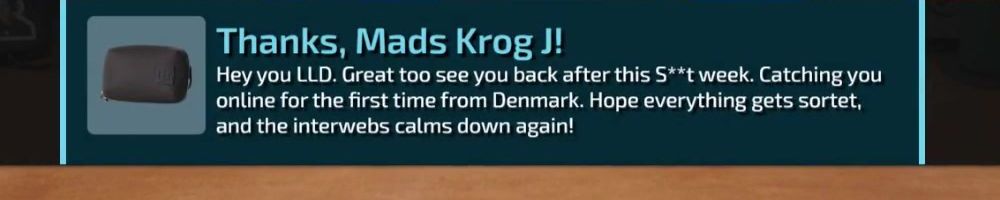 Hey you LLD. Great too see you back after this S**t week. Catching you online for the first time from Denmark. Hope everything gets sortet, and the interwebs calms down again!