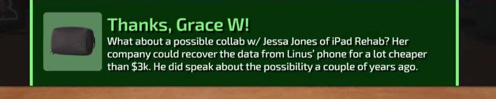 What about a possible collab w/ Jessa Jones of iPad Rehab? Her company could recover the data from Linus’ phone for a lot cheaper than $3k. He did speak about the possibility a couple of years ago.