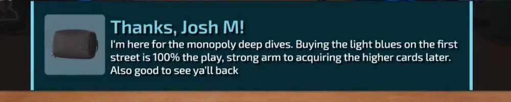I'm here for the monopoly deep dives. Buying the light blues on the first street is 100% the play, strong arm to acquiring the higher cards later. Also good to see ya'll back