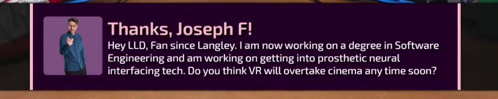 Hey LLD, Fan since Langley. I am now working on a degree in Software Engineering and am working on getting into prosthetic neural interfacing tech. Do you think VR will overtake cinema any time soon?