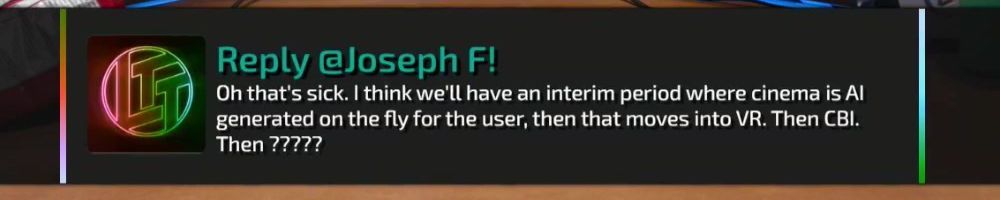 Oh that's sick. I think we'll have an interim period where cinema is AI generated on the fly for the user, then that moves into VR. Then CBI. Then ?????