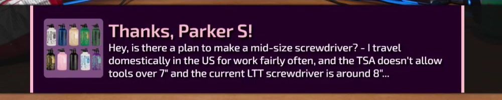 Hey, is there a plan to make a mid-size screwdriver? - I travel domestically in the US for work fairly often, and the TSA doesn't allow tools over 7" and the current LTT screwdriver is around 8"...