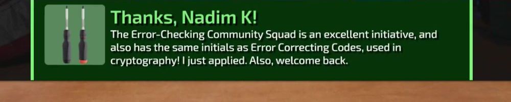 The Error-Checking Community Squad is an excellent initiative, and also has the same initials as Error Correcting Codes, used in cryptography! I just applied. Also, welcome back.