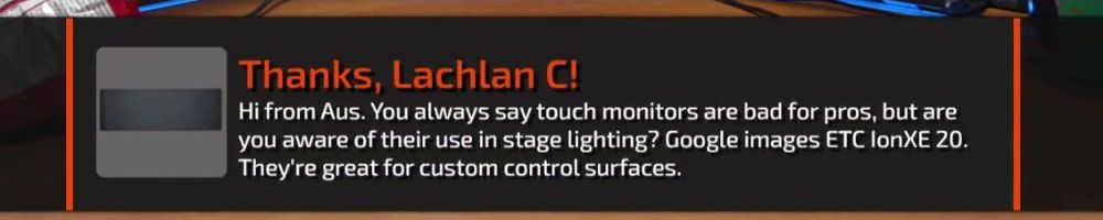 Hi from Aus. You always say touch monitors are bad for pros, but are you aware of their use in stage lighting? Google images ETC lonXE 20. They're great for custom control surfaces.