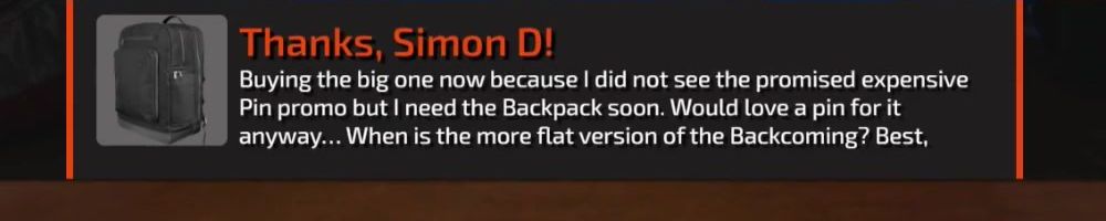 Buying the big one now because I did not see the promised expensive Pin promo but I need the Backpack soon. Would love a pin for it anyway... When is the more flat version of the Backcoming? Best,