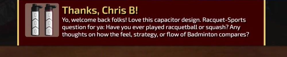 Yo, welcome back folks! Love this capacitor design. Racquet-Sports question for ya: Have you ever played racquetball or squash? Any thoughts on how the feel, strategy, or flow of Badminton compares?
