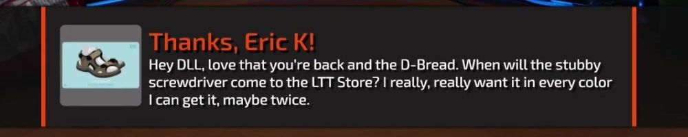Hey DLL, love that you're back and the D-Bread. When will the stubby screwdriver come to the LTT Store? I really, really want it in every color I can get it, maybe twice.