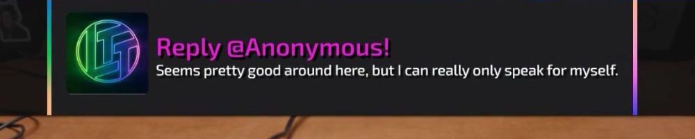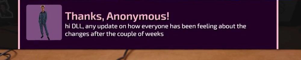 Thanks, Anonymous! hi DLL, any update on how everyone has been feeling about the changes after the couple of weeks