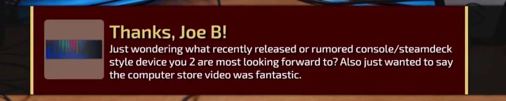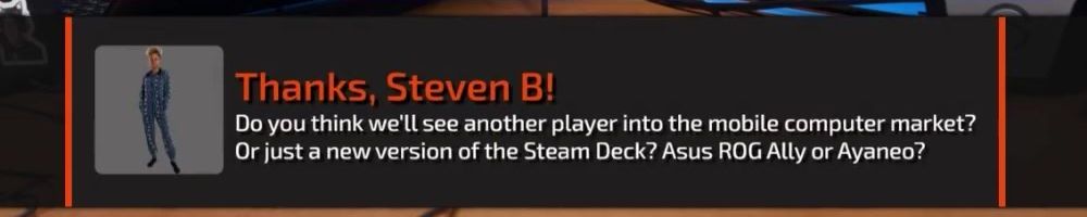 Thanks, Steven B! Do you think we'll see another player into the mobile computer market? Or just a new version of the Steam Deck? Asus ROG Ally or Ayaneo?