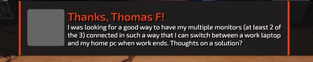 Thanks, Thomas F! I was looking for a good way to have my multiple monitors (at least 2 of the 3) connected in such a way that I can switch between a work laptop and my home pc when work ends. Thoughts on a solution?