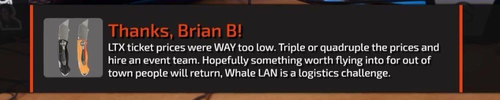 Thanks, Brian B! LTX ticket prices were WAY too low. Triple or quadruple the prices and hire an event team. Hopefully something worth flying into for out of town people will return, Whale LAN is a logistics challenge.