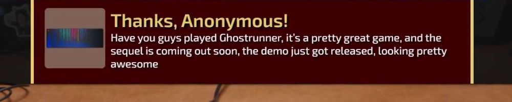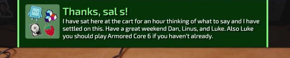 Thanks, sals! I have sat here at the cart for an hour thinking of what to say and I have settled on this. Have a great weekend Dan, Linus, and Luke. Also Luke you should play Armored Core 6 if you haven't already.