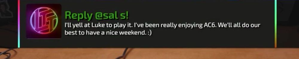 Reply @sal s! I'll yell at Luke to play it. I've been really enjoying AC6. We'll all do our best to have a nice weekend. :)
