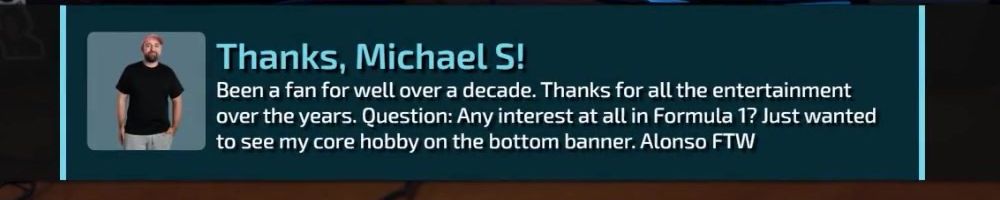 Thanks, Michael S! Been a fan for well over a decade. Thanks for all the entertainment over the years. Question: Any interest at all in Formula 1? Just wanted to see my core hobby on the bottom banner. Alonso FTW