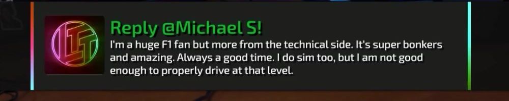 Reply @Michael S! I'm a huge F1 fan but more from the technical side. It's super bonkers and amazing. Always a good time. I do sim too, but I am not good enough to properly drive at that level.