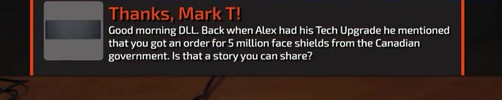 Thanks, Mark T! Good morning DLL. Back when Alex had his Tech Upgrade he mentioned that you got an order for 5 million face shields from the Canadian government. Is that a story you can share?