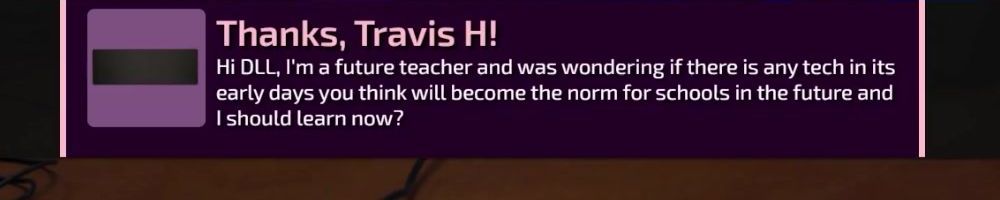Thanks, Travis H! Hi DLL, I'm a future teacher and was wondering if there is any tech in its early days you think will become the norm for schools in the future and I should learn now?