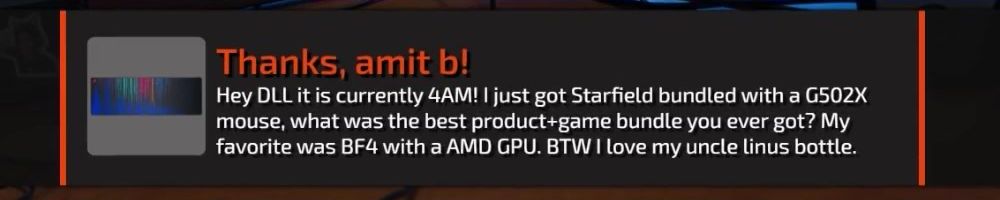 Thanks, amit b! Hey DLL it is currently 4AM! I just got Starfield bundled with a G502X mouse, what was the best product+game bundle you ever got? My favorite was BF4 with a AMD GPU. BTW I love my uncle linus bottle.