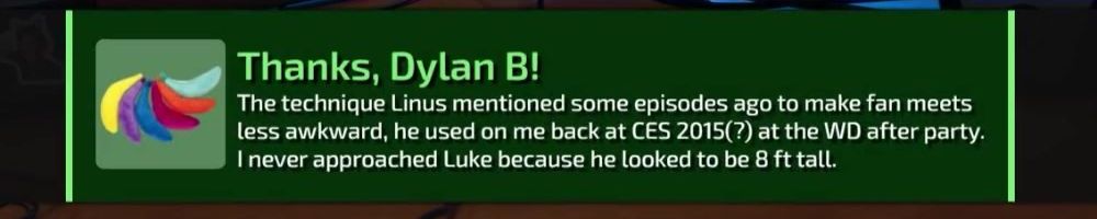 Thanks, Dylan B! The technique Linus mentioned some episodes ago to make fan meets less awkward, he used on me back at CES 2015(?) at the WD after party. I never approached Luke because he looked to be 8 ft tall.