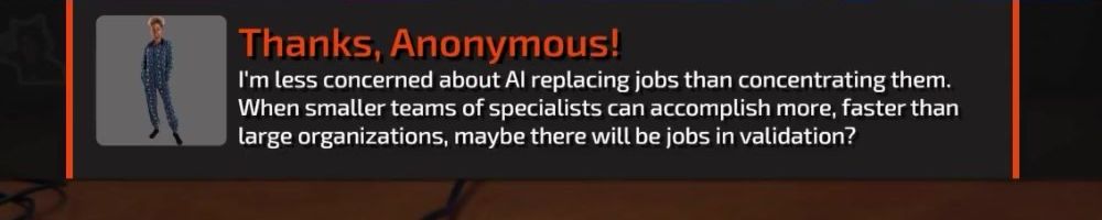 Thanks, Anonymous! I'm less concerned about AI replacing jobs than concentrating them. When smaller teams of specialists can accomplish more, faster than large organizations, maybe there will be jobs in validation?