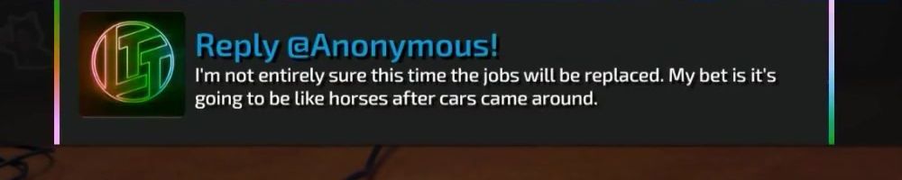 Reply @Anonymous! I'm not entirely sure this time the jobs will be replaced. My bet is it's going to be like horses after cars came around.