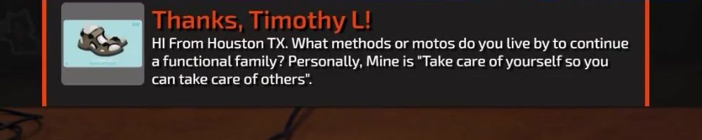 Thanks, Timothy L! HI From Houston TX. What methods or motos do you live by to continue a functional family? Personally, Mine is "Take care of yourself so you can take care of others".