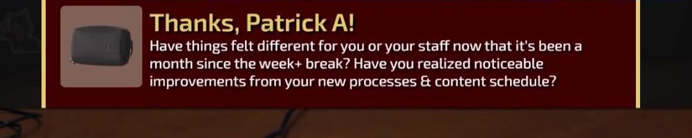 Thanks, Patrick A! Have things felt different for you or your staff now that it's been a month since the week+ break? Have you realized noticeable improvements from your new processes & content schedule?