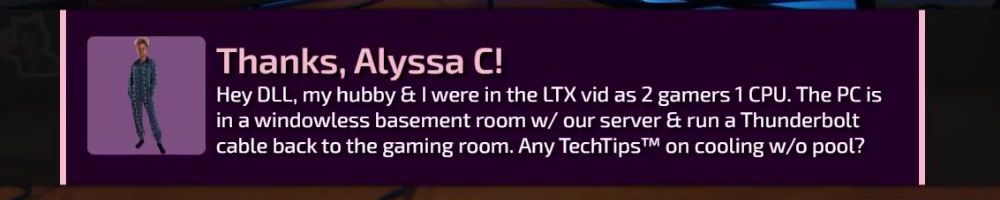 Thanks, Alyssa C! Hey DLL, my hubby & I were in the LTX vid as 2 gamers 1 CPU. The PC is in a windowless basement room w/ our server & run a Thunderbolt cable back to the gaming room. Any TechTips™ on cooling w/o pool?