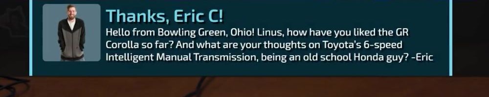 Thanks, Eric C! Hello from Bowling Green, Ohio! Linus, how have you liked the GR Corolla so far? And what are your thoughts on Toyota's 6-speed Intelligent Manual Transmission, being an old school Honda guy? -Eric