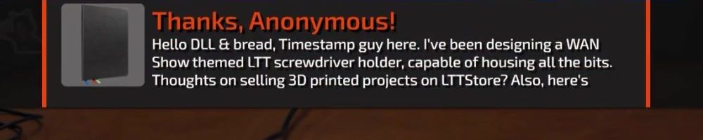 Thanks, Anonymous! Hello DLL & bread, Timestamp guy here. I've been designing a WAN Show themed LTT screwdriver holder, capable of housing all the bits. Thoughts on selling 3D printed projects on LTTStore? Also, here's