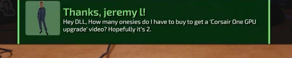 Thanks, jeremy U! Hey DLL, How many onesies do I have to buy to get a 'Corsair One GPU upgrade' video? Hopefully it's 2.