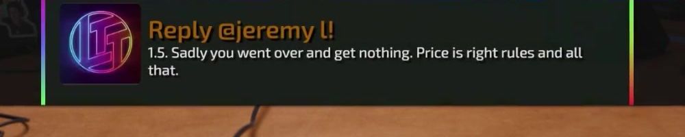 Reply @jeremy U! 1.5. Sadly you went over and get nothing. Price is right rules and all that.