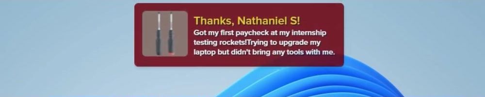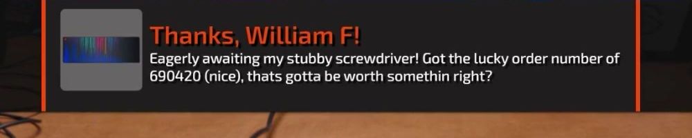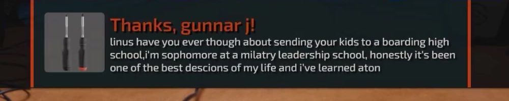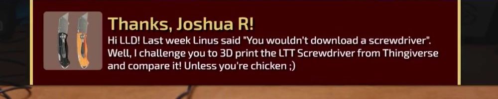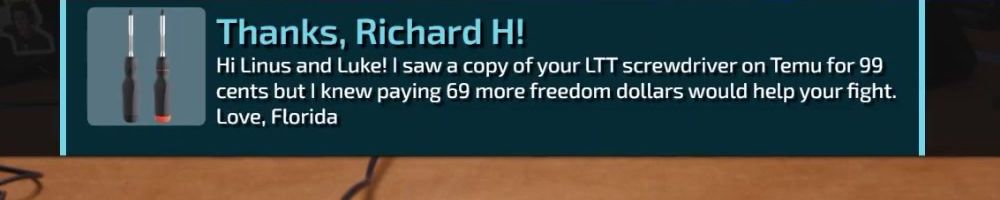 Thanks, Richard H! Hi Linus and Luke! I saw a copy of your LTT screwdriver on Temu for 99 cents but I knew paying 69 more freedom dollars would help your fight. Love, Florida
