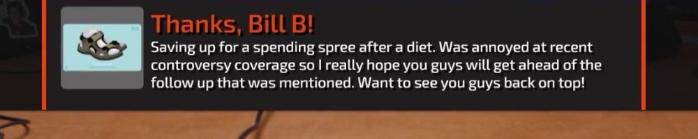 Thanks, Bill B! Saving up for a spending spree after a diet. Was annoyed at recent controversy coverage so I really hope you guys will get ahead of the follow up that was mentioned. Want to see you guys back on top!