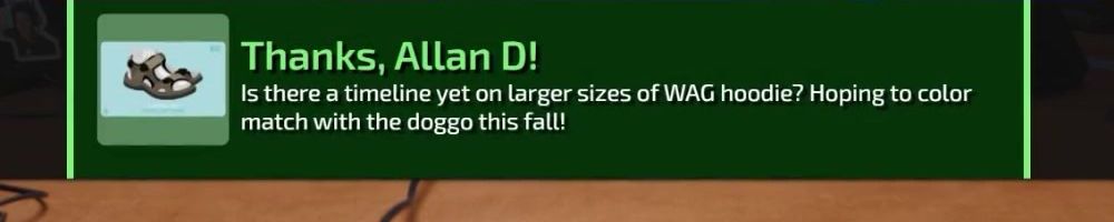 Thanks, Allan D! Is there a timeline yet on larger sizes of WAG hoodie? Hoping to color match with the doggo this fall!