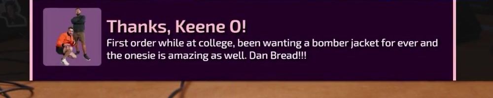 Thanks, Keene O! First order while at college, been wanting a bomber jacket for ever and the onesie is amazing as well. Dan Bread!!!