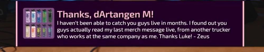 Thanks, dArtangen M! I haven't been able to catch you guys live in months. I found out you guys actually read my last merch message live, from another trucker who works at the same company as me. Thanks Luke! - Zeus