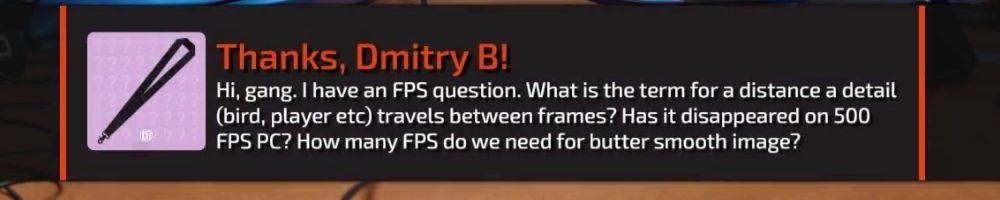 Thanks, Dmitry B! Hi, gang. I have an FPS question. What is the term for a distance a detail (bird, player etc) travels between frames? Has it disappeared on 500 FPS PC? How many FPS do we need for butter smooth image?