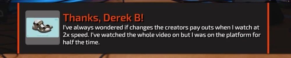 Thanks, Derek B! I've always wondered if changes the creators pay outs when I watch at 2x speed. I've watched the whole video on but I was on the platform for half the time.