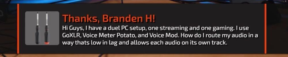 Thanks, Branden H! Hi Guys, I have a duel PC setup, one streaming and one gaming. I use GoXLR, Voice Meter Potato, and Voice Mod. How do I route my audio in a way that's low in lag and allows each audio on its own track.