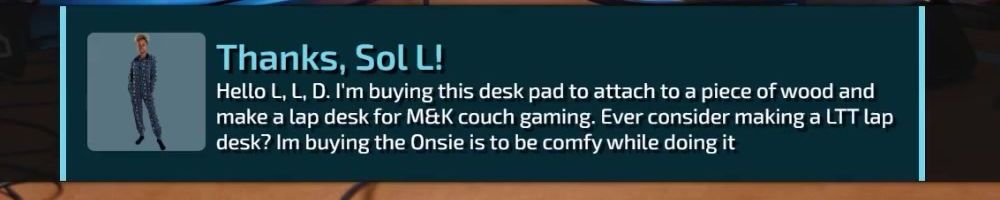 Thanks, Sol L! Hello L, L, D. I'm buying this desk pad to attach to a piece of wood and make a lap desk for M&K couch gaming. Ever consider making a LTT lap desk? Im buying the Onsie is to be comfy while doing it