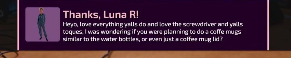 Thanks, Luna R! Heyo, love everything yalls do and love the screwdriver and yalls toques, I was wondering if you were planning to do a coffe mugs similar to the water bottles, or even just a coffee mug lid?
