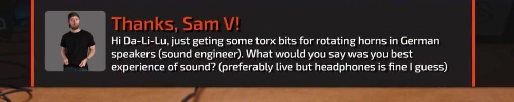Thanks, Sam V! Hi Da-Li-Lu, just geting some torx bits for rotating horns in German speakers (sound engineer). What would you say was you best experience of sound? (preferably live but headphones is fine I guess)