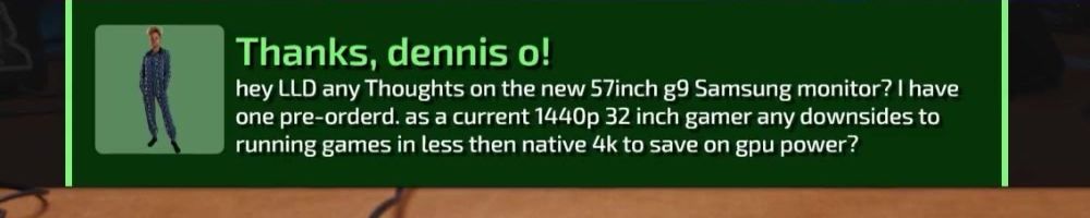 Thanks, dennis o! hey LLD any Thoughts on the new 57inch g9 Samsung monitor? I have one pre-orderd. as a current 1440p 32 inch gamer any downsides to running games in less then native 4k to save on gpu power?